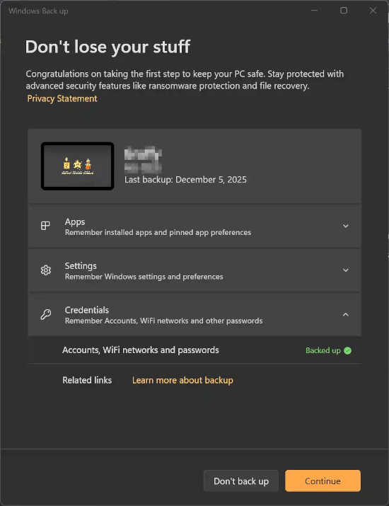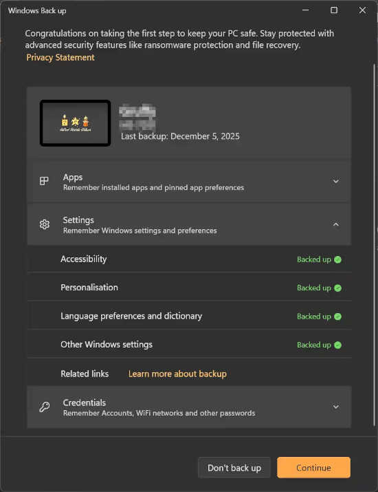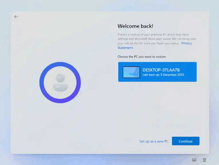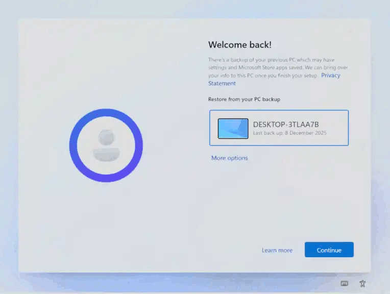- Select Continue to restore backed-up user settings and Microsoft Store apps.