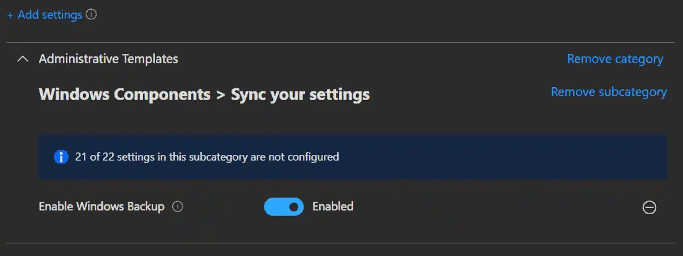 Add settings, select Administrative Templates\Windows Components\Sync your settings\Enable Windows Backup and set it to Enabled.