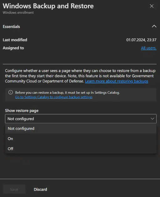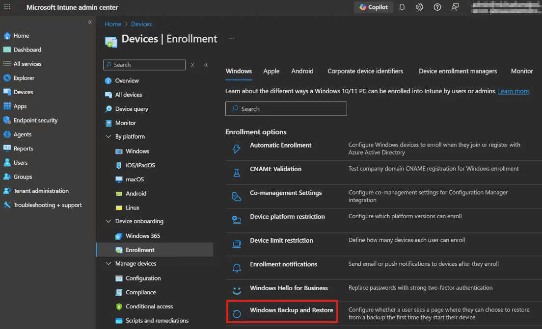 - Sign in to the Intune admin center -> Devices -> Enrollment and select Windows Backup and Restore.