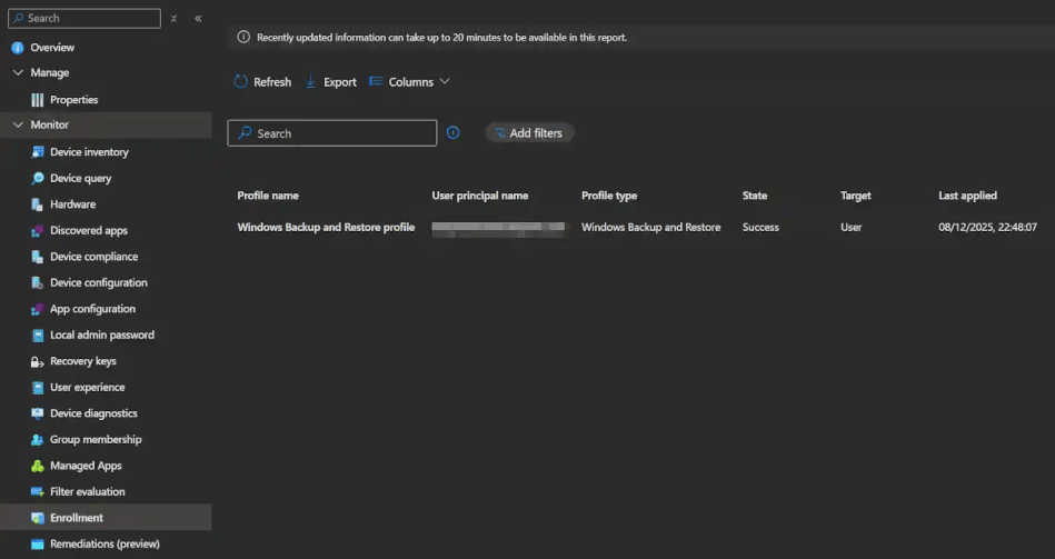 To view reporting on device restores, sign in to the Intune admin center, navigate to Devices, select the device that used the restore option during OOBE and you will be able to see the restore status in the Enrollment section.
